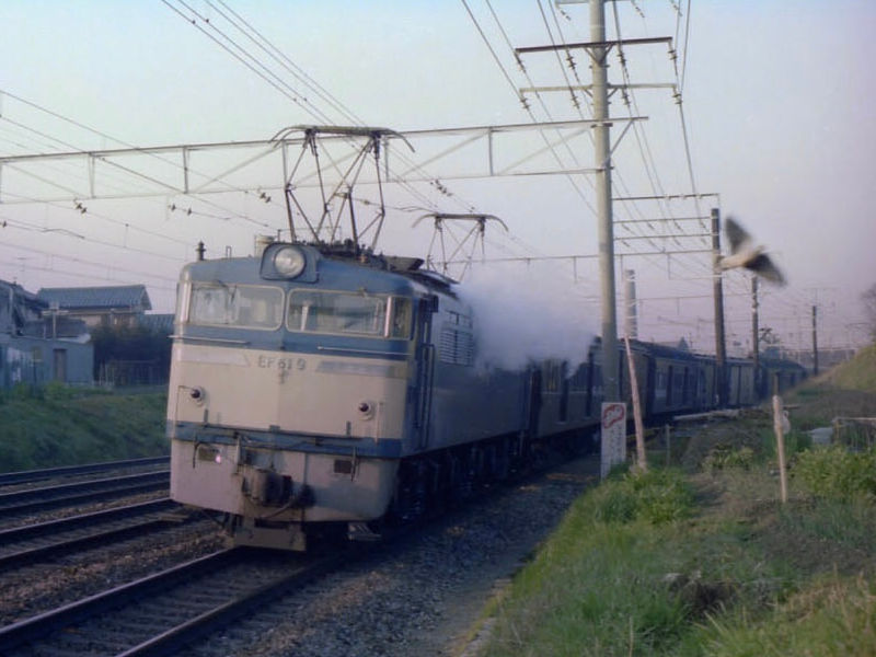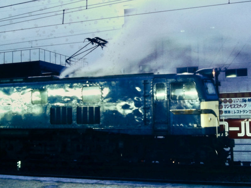 備 考 = 荷物列車の機関車交換に備えるEF58(斑点はポジのいたみです) |